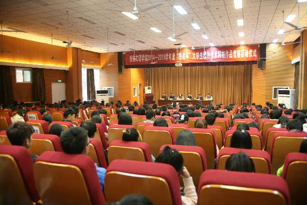 10月30日(星期四)下午14:00,由校团委主办,物电学院承办的2014-2015学年“挑战杯”大学生课外学术科技竞赛启动仪式在明德楼A区报告厅举行。校团委书记成瑶、物电学院党总支副书记于浦,西安交通大学团委科技实践部部长张彦鹏、航模队宣传部长孟国涛以及我校各学院分团委书记,师生代表300余人参加了启动仪式。仪式由校团委副书记武文斌主持。