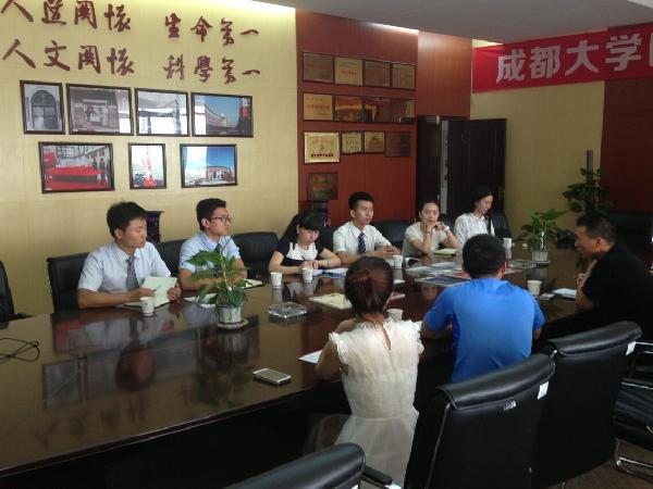 成都大学是成都市人民政府主办的唯一一所全日制普通本科院校,实行“省市共建、以市为主”的办学体制。学校始建于1978年,先后由成都教育学院、成都幼儿师范学校、成都卫生学校和成都铁路中心医院(三级甲等医院)合并而成。学校秉承“自爱、自修、自尊、自强”的校训,发扬“求真务实、自强不息”的精神,以服务成都经济社会发展为己任,以培养高素质应用型人才为目标,不断深化教学改革,提高教育质量,加快推进创建国内知名城市型综合大学步伐。 此次“青春事业,相携共进”赴成都大学工作调研实践活动得到了成都大学学工部、团委的大力支持,学工部副部长徐庆荣,校团委书记李维热情接待我校实践队员,在座谈中,双方代表就科技创新、组织发展、思想引领、学生会社团建设、艺术团等方面进行了深入的交流和探讨,令我校实践队员们感触最深的是,成都大学在思想引领方面的品牌工程“时事月月谈”以及在科技创新方面的“学生发展与素质提升工程”。在调研期间,实践队员们参观了成都大学美丽的校园、图书馆、大学生活动中心以及“科创杯”学生课外学术作品展览和电子创新实验室。