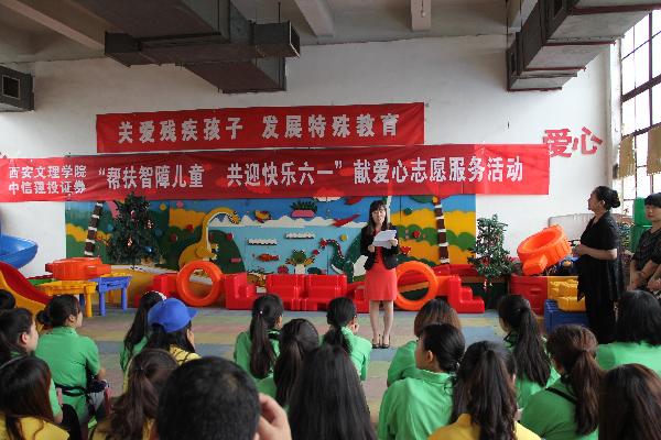 活动现场,校教工团总支书记王莉、幼儿师范学院团委书记周薇和中信建投证券西北分公司代表向参加活动的智障儿童表达了亲切的问候,并送去了10000余元的爱心物资,学生志愿者们表演了孩子们喜爱的舞蹈,并同孩子们一起唱歌跳舞,陪小朋友们玩游戏,现场气氛一片祥和。
