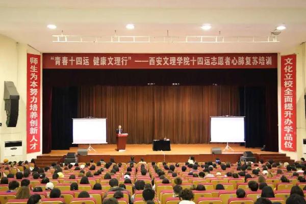 4月14日下午,西安市卫健委、市中心医院在我校大礼堂举办“青春十四运 健康文理行”——华体会·HTH(中国大陆)官方网站十四运志愿者心肺复苏培训活动。市卫健委科教处程婕处长,市中心医院虎威院长、郭华副院长、中心医院神经内科护士长周彦芝团队,校团委副书记武文斌及学校十四运志愿者、第十四期青马班学员共计600余人参加了培训活动。